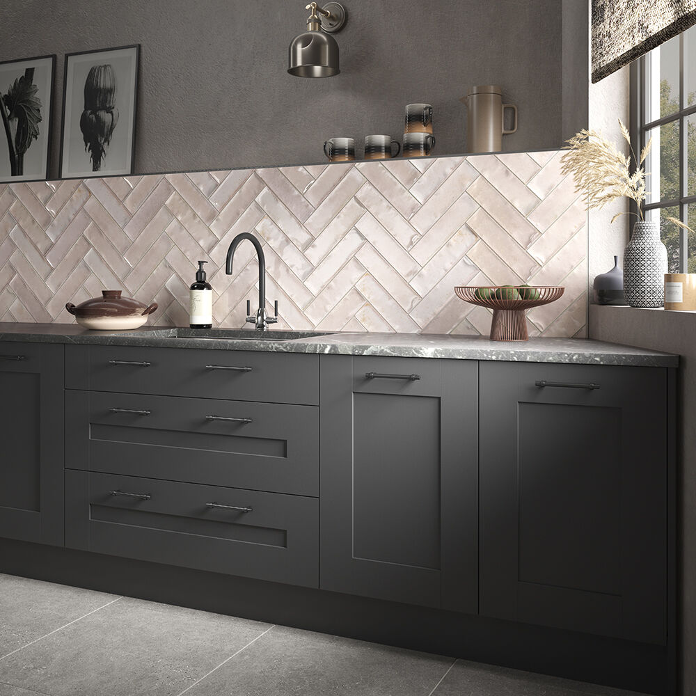 Hope Rose Gloss Ceramic Wall Tile 75x300mm feature an on-trend blush pink shade, with an aged and distressed appearance. They can be tiled in a variety of ways from brick bond or herringbone.
