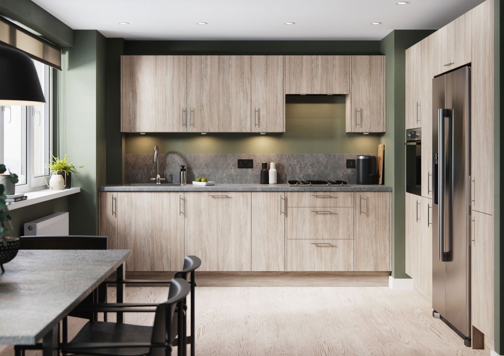 Our Piatto Oyster Oak Slab Kitchen Cabinets provides a Scandinavian feel to your kitchen, while a simple handle allows the furniture to be the focus of the room.